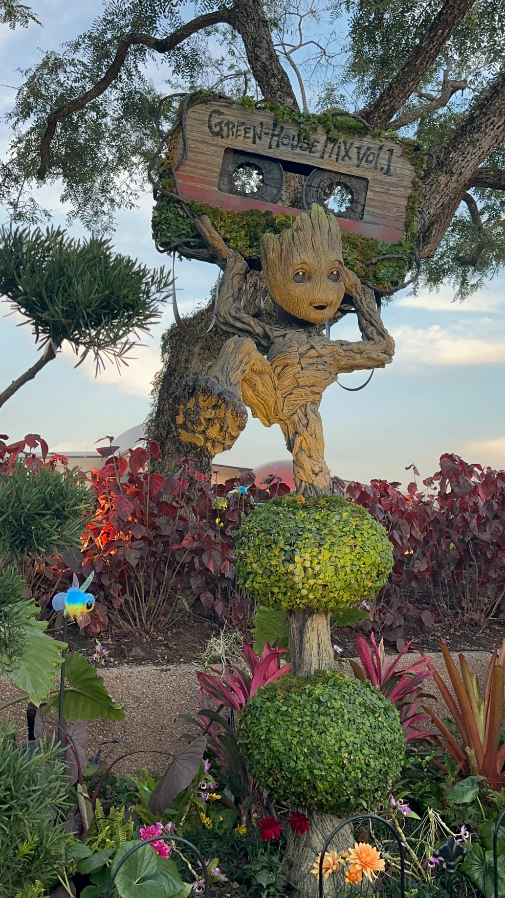 Groot, the beloved “flora colossus” from Guardians of the Galaxy, is now a topiary masterpiece near the Guardians of the Galaxy: Cosmic Rewind attraction. In true Groot fashion, this topiary adds a playful twist—Groot is trying his hand at creating his own topiary! If you look closely, you’ll spot a mixtape homage to Disney’s horticulture team.