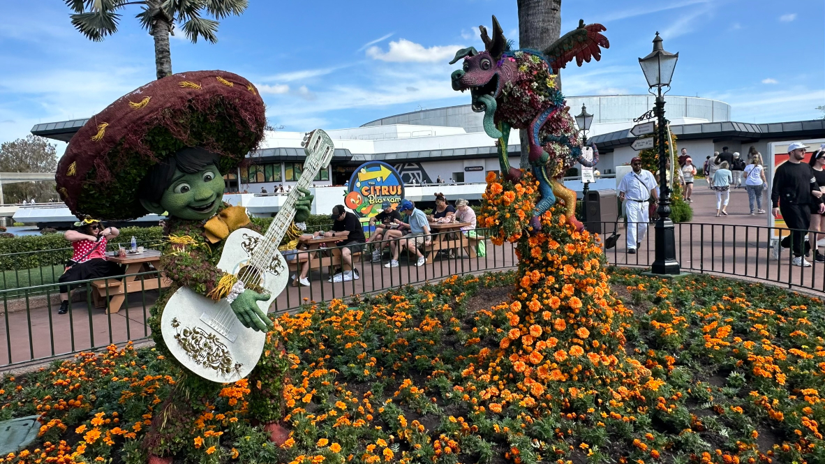 In the Mexico Pavilion, Coco fans can enjoy topiaries of Miguel and his loyal companion, Dante. These vibrant displays bring the magic of Coco to life, creating the perfect photo backdrop.