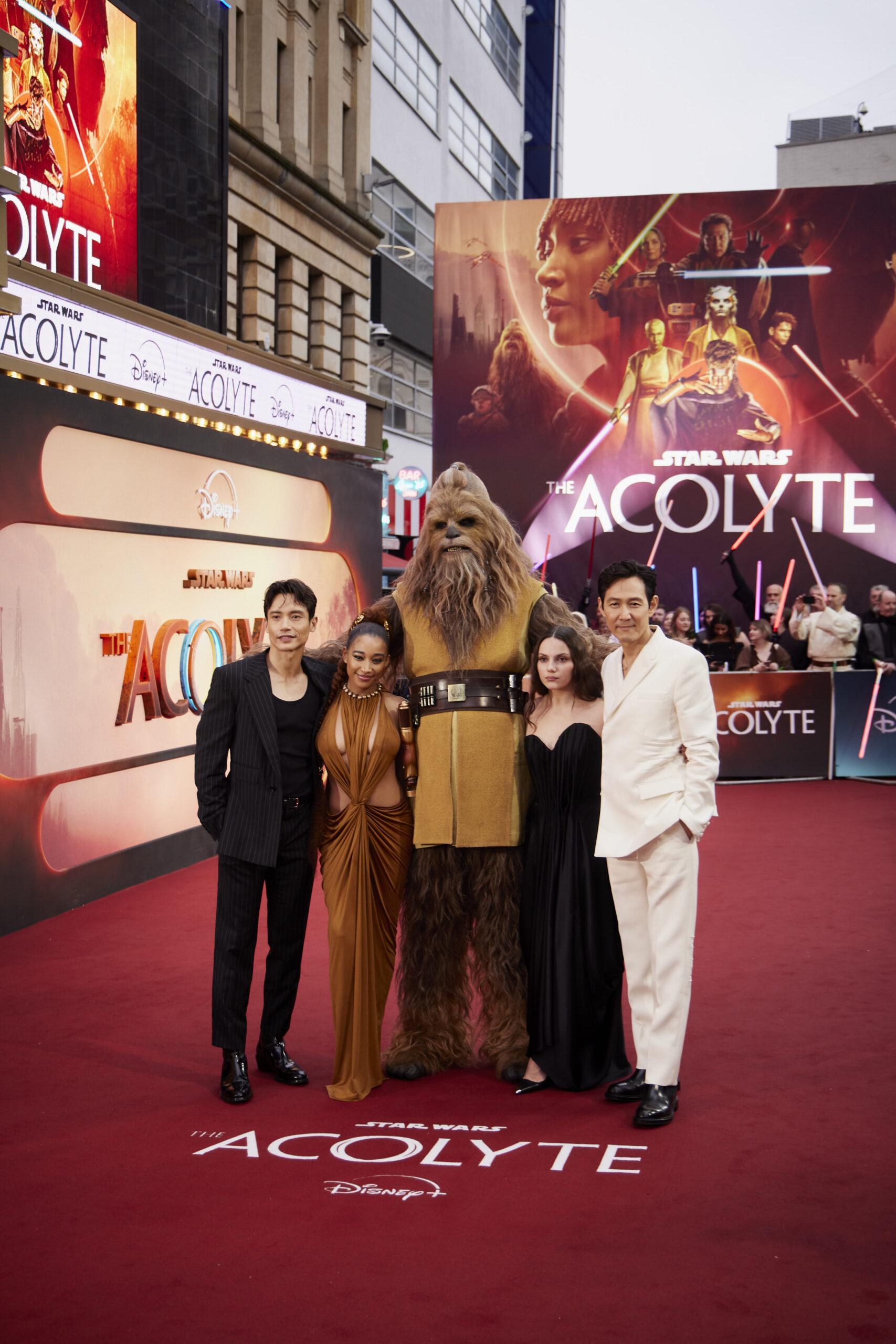 (L to R) Rebecca Henderson, Manny Jacinto, Amandla Stenberg, Kelnacca, Dafne Keen Fernández, Charlie Barnett and Lee Jeong-jae attend the UK Premiere of Lucasfilm’s ‘The Acolyte’ at Odeon Luxe Leicester Square in London, on May 28, 2024. (Photo by StillMoving.Net for Disney)
