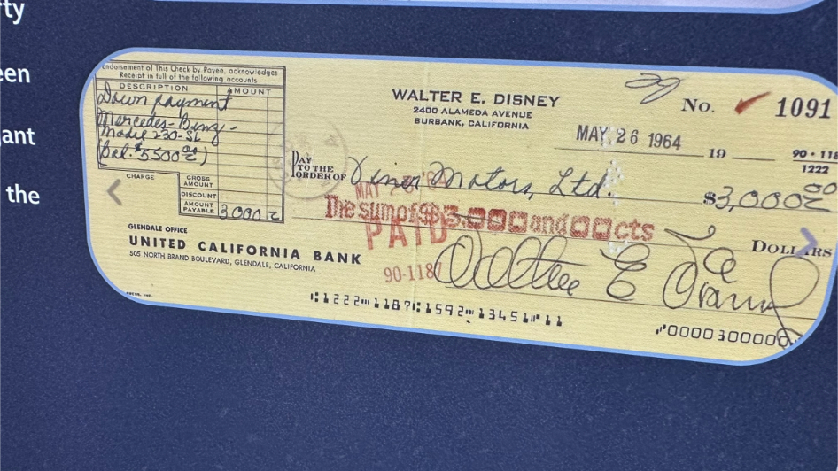 Walt Disney Archives Great Big Beautiful Car Show D23 2024 – Walt Disney’s 1964 Mercedes-Benz 230SL – Walt’s Personal Check