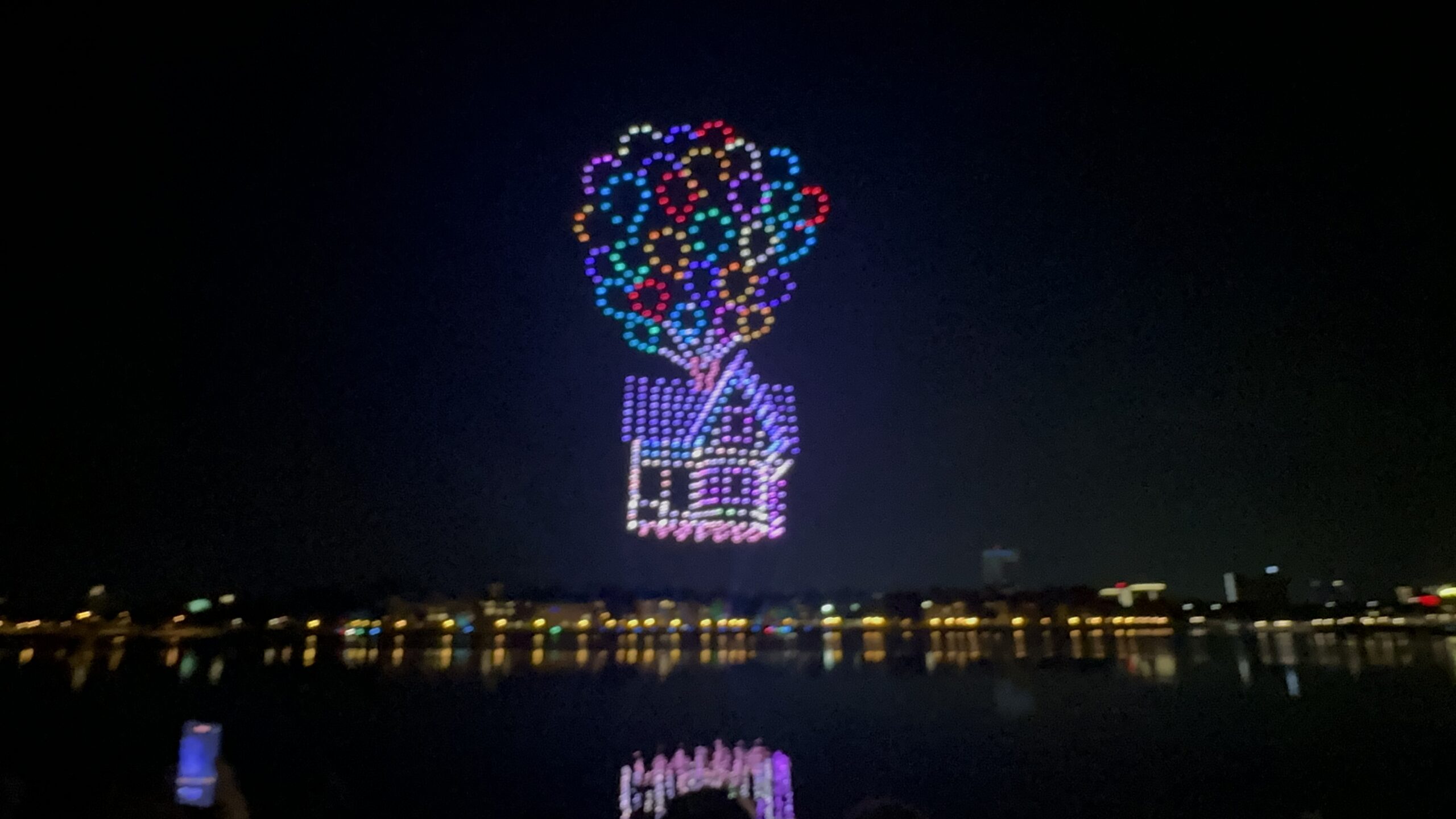 Drones magically form various Disney characters in the sky, including Wall-E &; Eve from Pixar’s “Wall-E,”