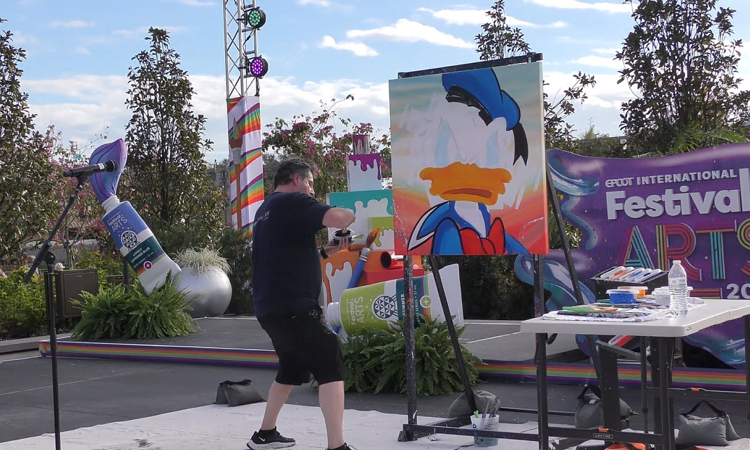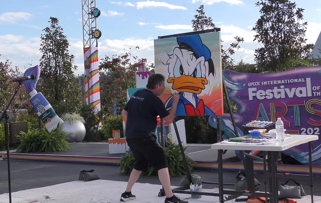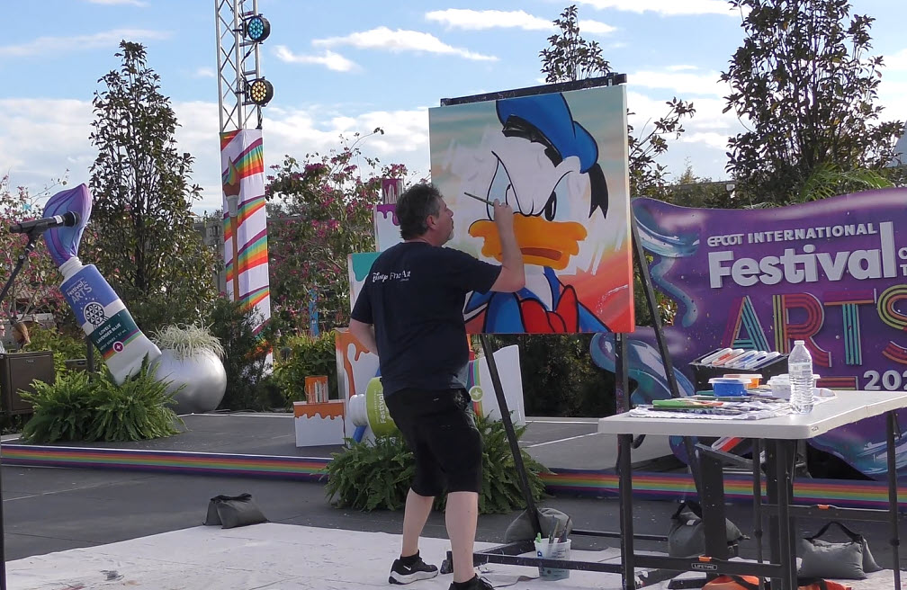 Trevor Carlton brings Donald Duck to life in a stunning live painting performance at the 2025 EPCOT Festival of the Arts on the CommuniCore Plaza stage