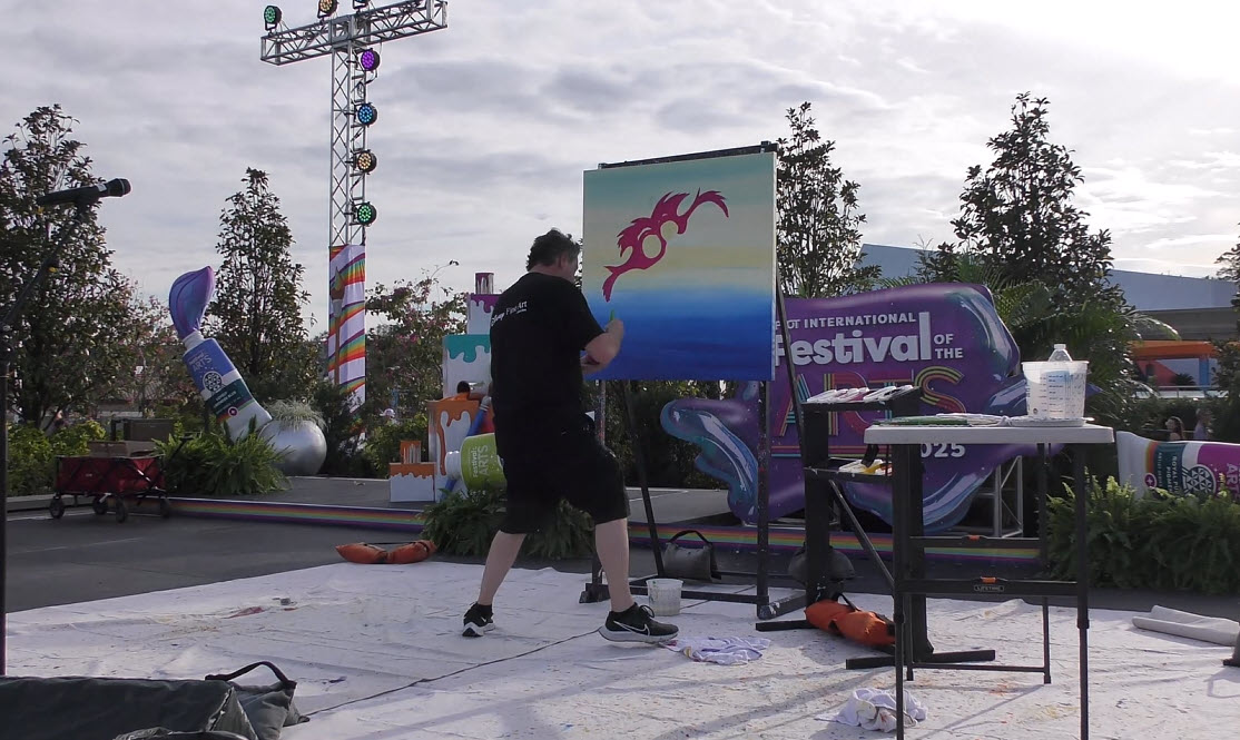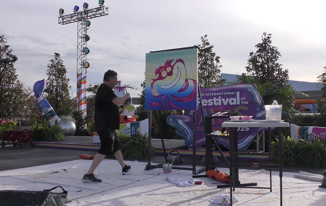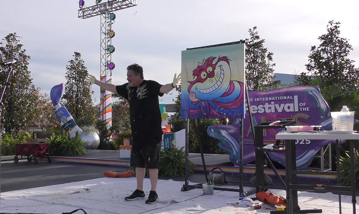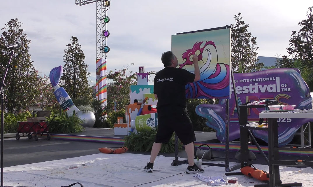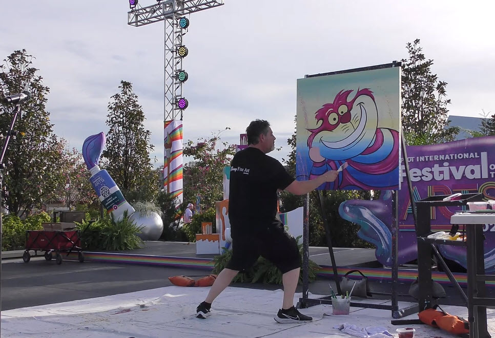 Trevor Carlton brings the whimsical Cheshire Cat to life during his live painting performance at the 2025 EPCOT Festival of the Arts in CommuniCore Plaza.