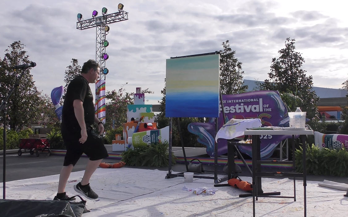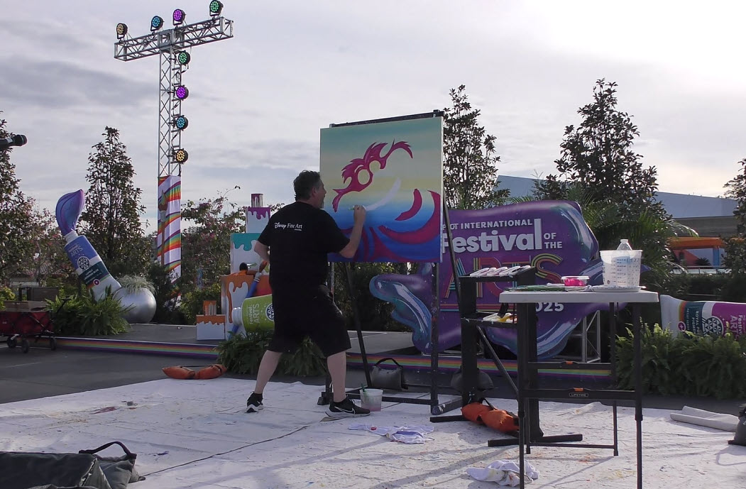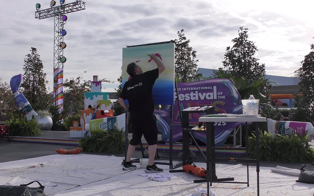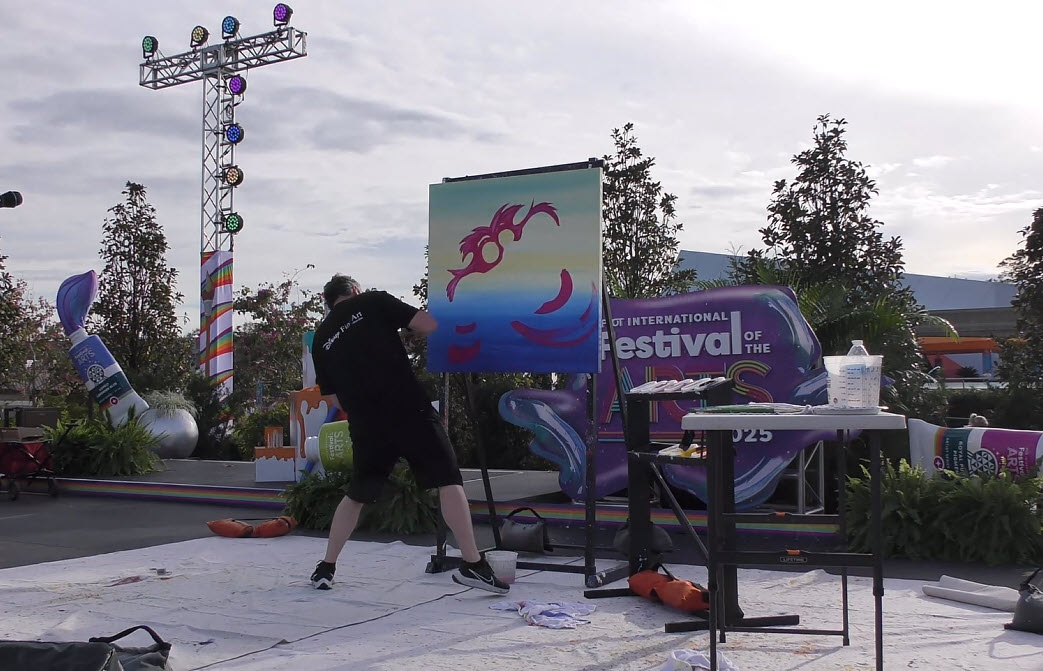 Trevor Carlton brings the whimsical Cheshire Cat to life during his live painting performance at the 2025 EPCOT Festival of the Arts in CommuniCore Plaza.