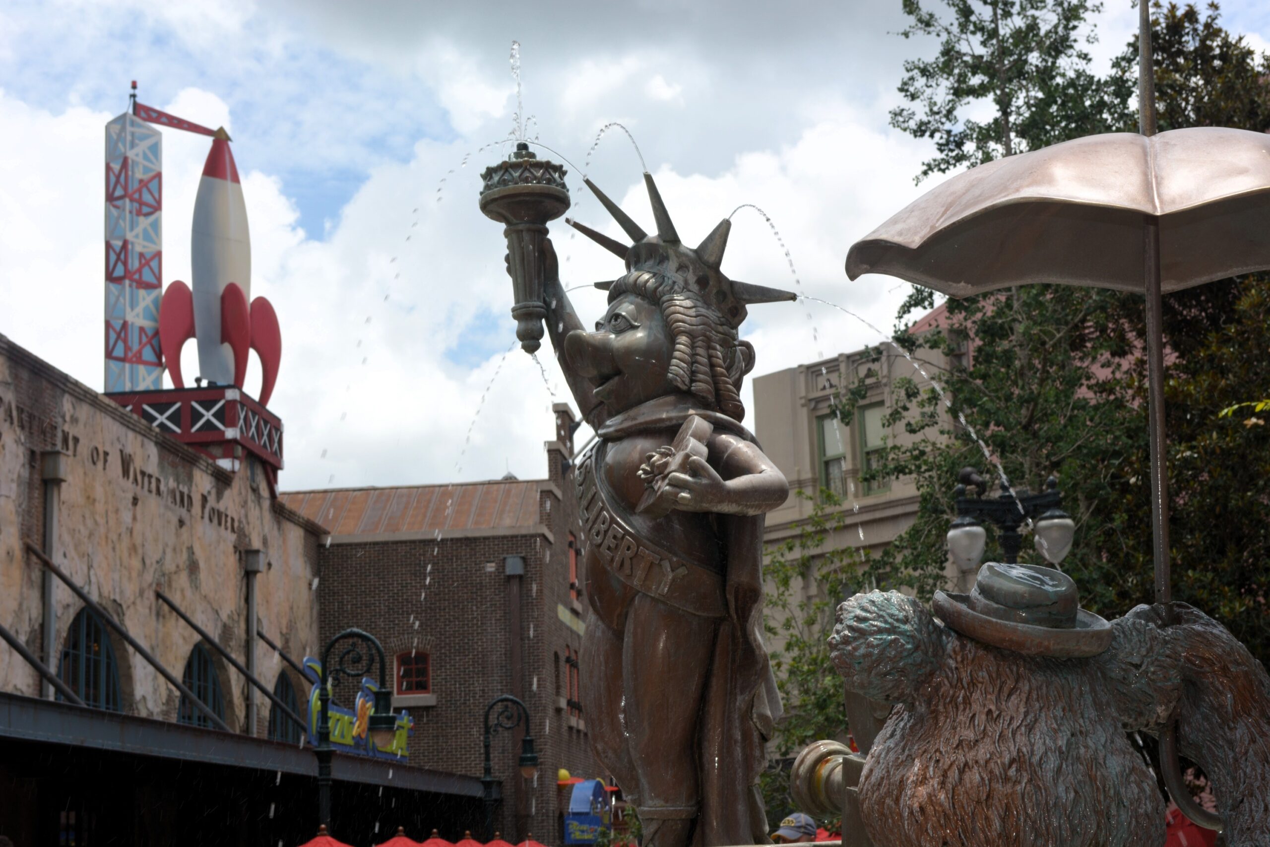 In this dated image, about 2010, Miss Piggy takes center stage in the Muppet fountain, a playful nod to the Statue of Liberty! With Pizza Planet Rocket in the background