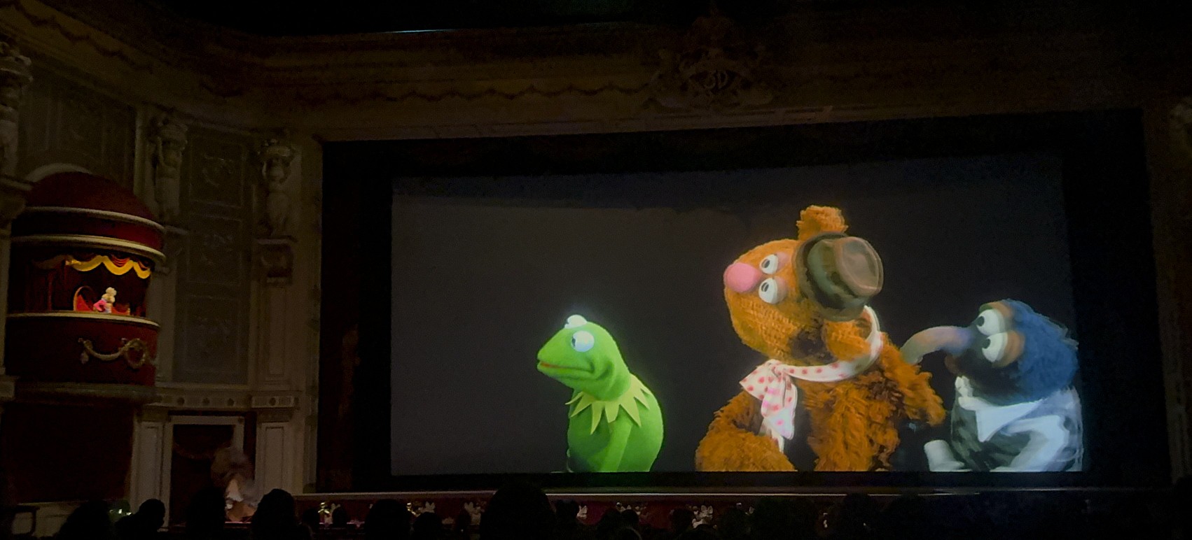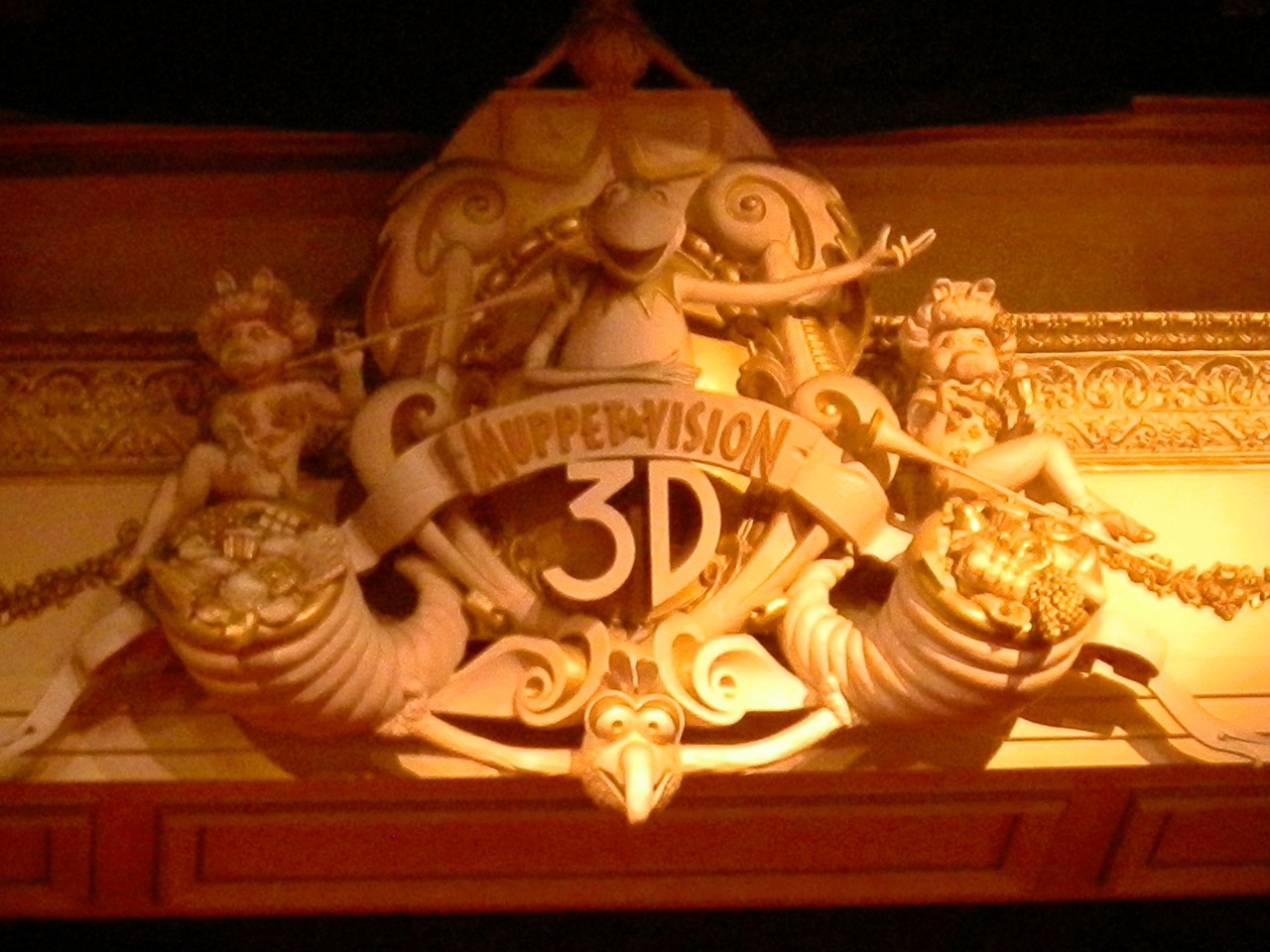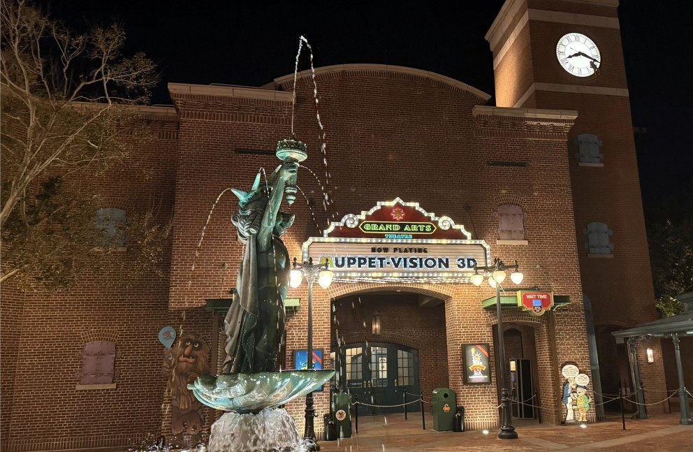 The grand entrance to Muppet Vision 3D, featuring Kermit’s classic marquee and the iconic Muppet Courtyard fountain.*