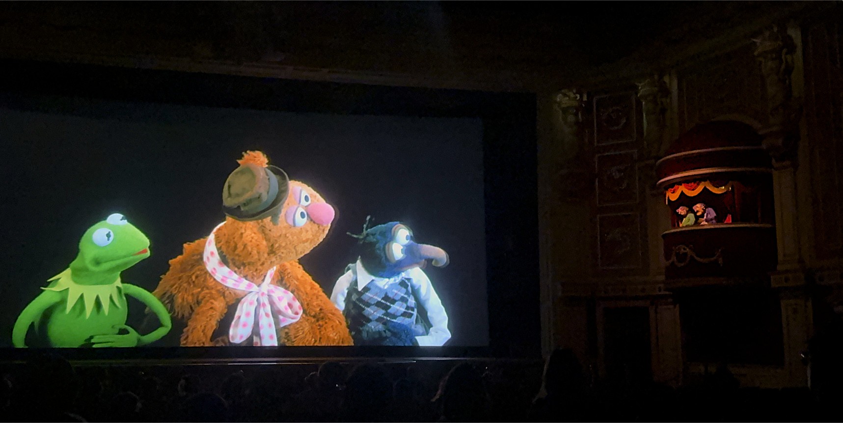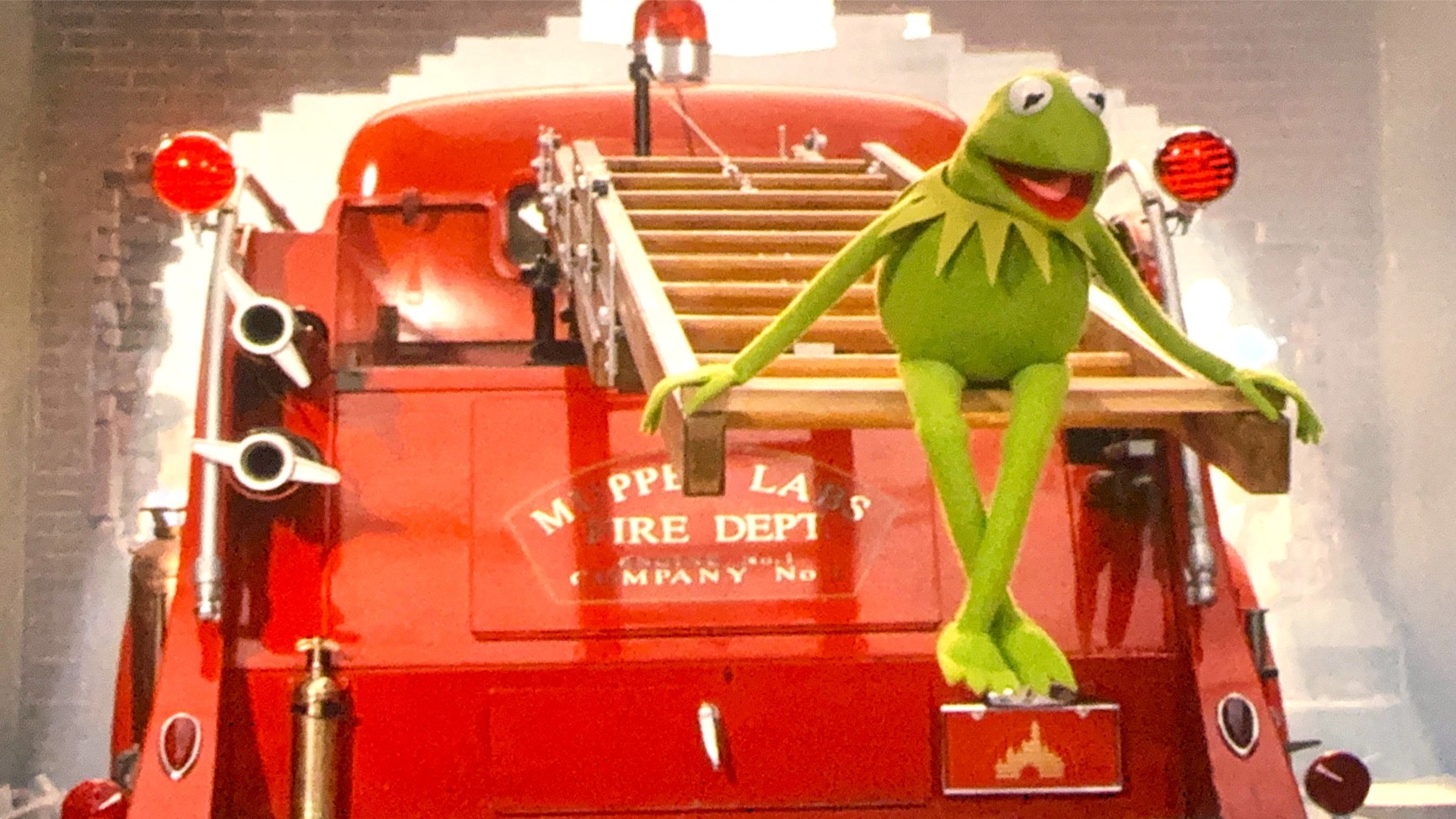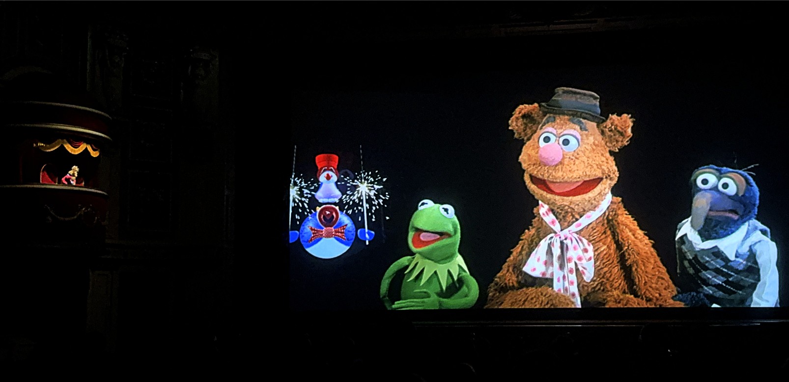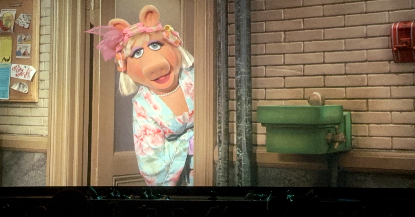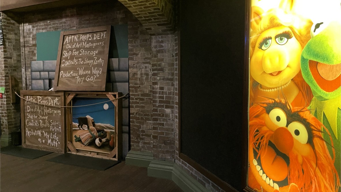 The pre-show area contains references to past Muppet productions, including crates labeled for Fraggle Rock and Pigs in Space.