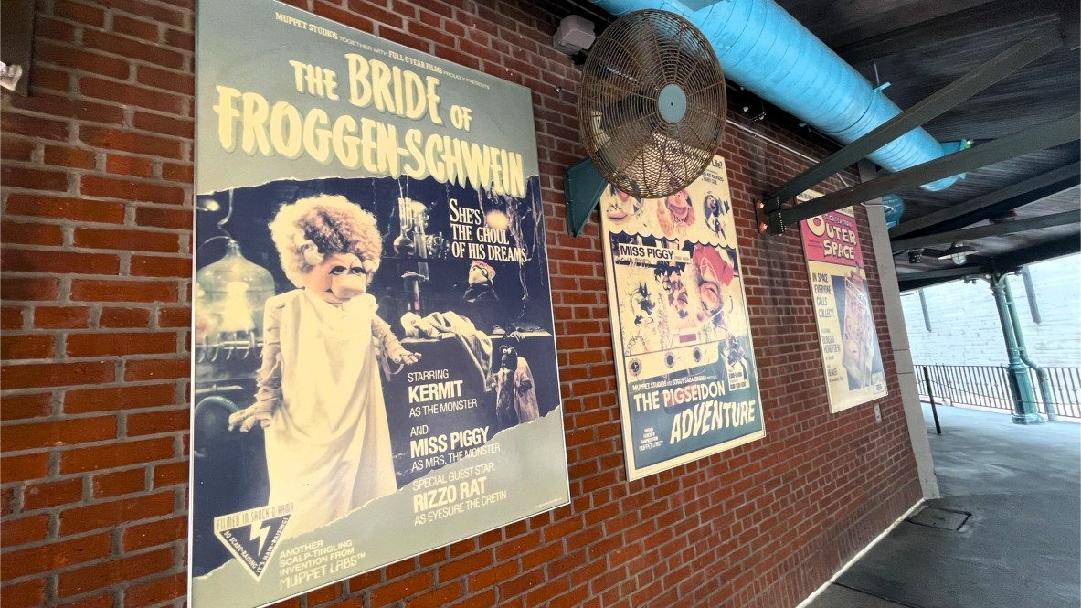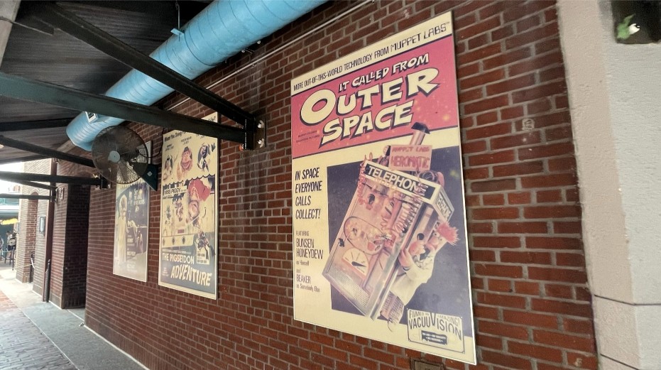 A rare look at the seldom-seen outdoor extended queue, featuring classic Muppet movie posters packed with puns and humor!