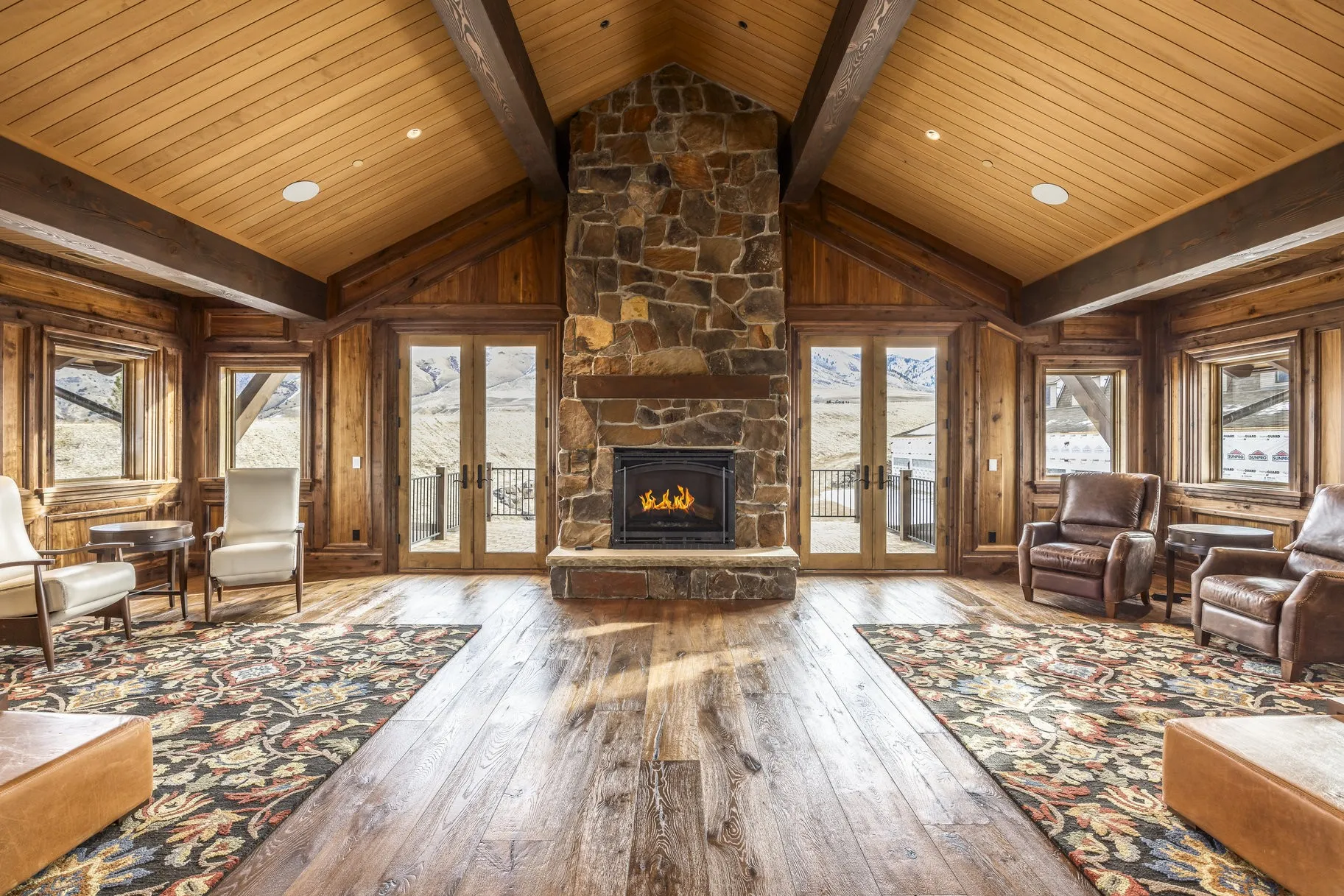 According to Realtor.com, the five-story main residence was built in 2019. It has ten bedrooms with walk-in closets, wet bars, and en-suite bathrooms. A formal dining room seats 42. A barn under construction will include a 16-car garage, an indoor pool, and a gym.