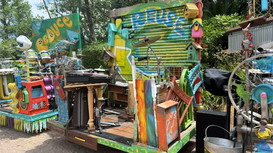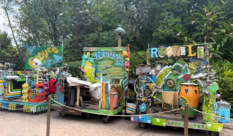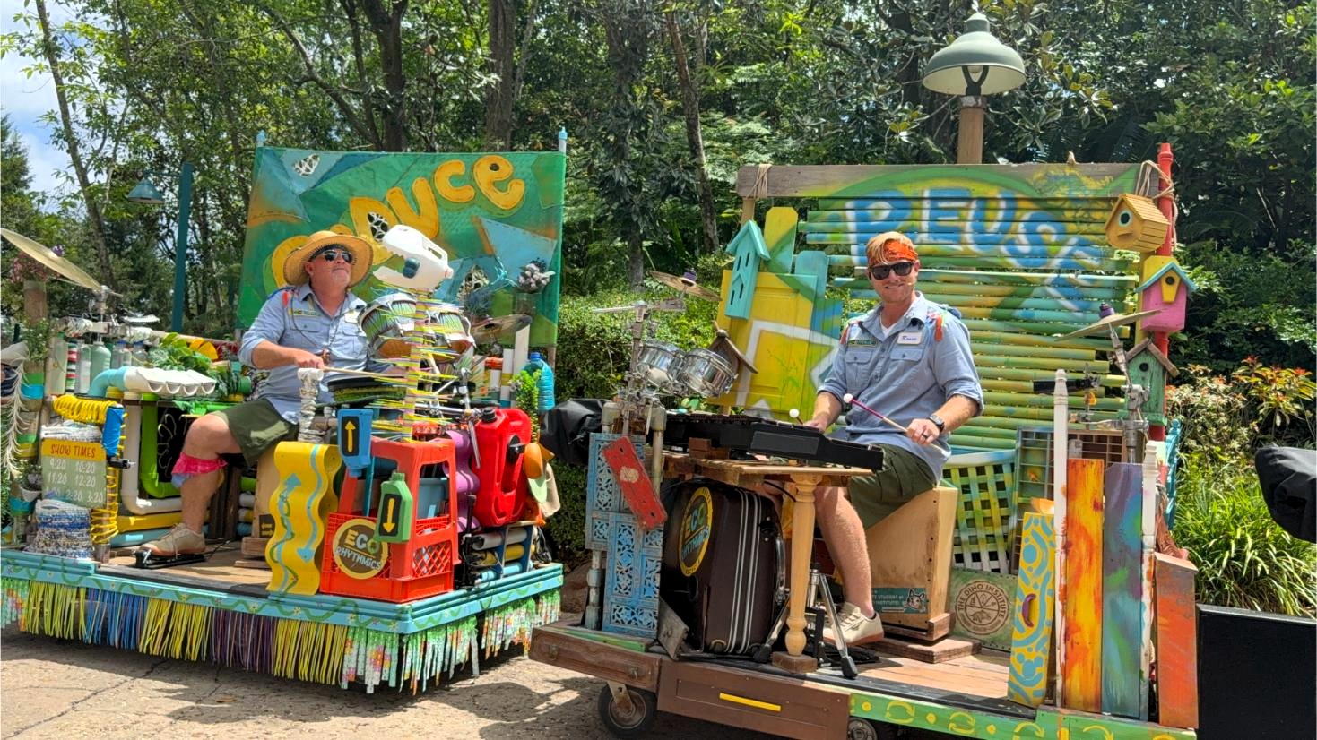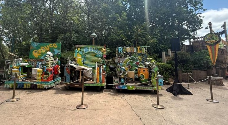 Originally located near Dino-O-Rama, but now behind construction walls, the Eco-Rhythmics have since moved near the entrance to Dinoland. The group uses instruments crafted from repurposed materials, including pots, pans, trash can lids, bicycle parts, and birdhouses. The result is a lively, crowd-engaging performance that blends music, humor, and environmental messaging.