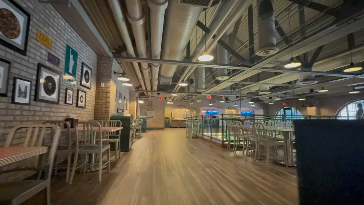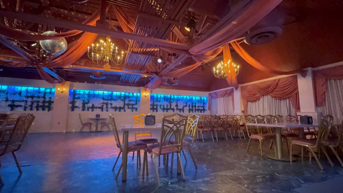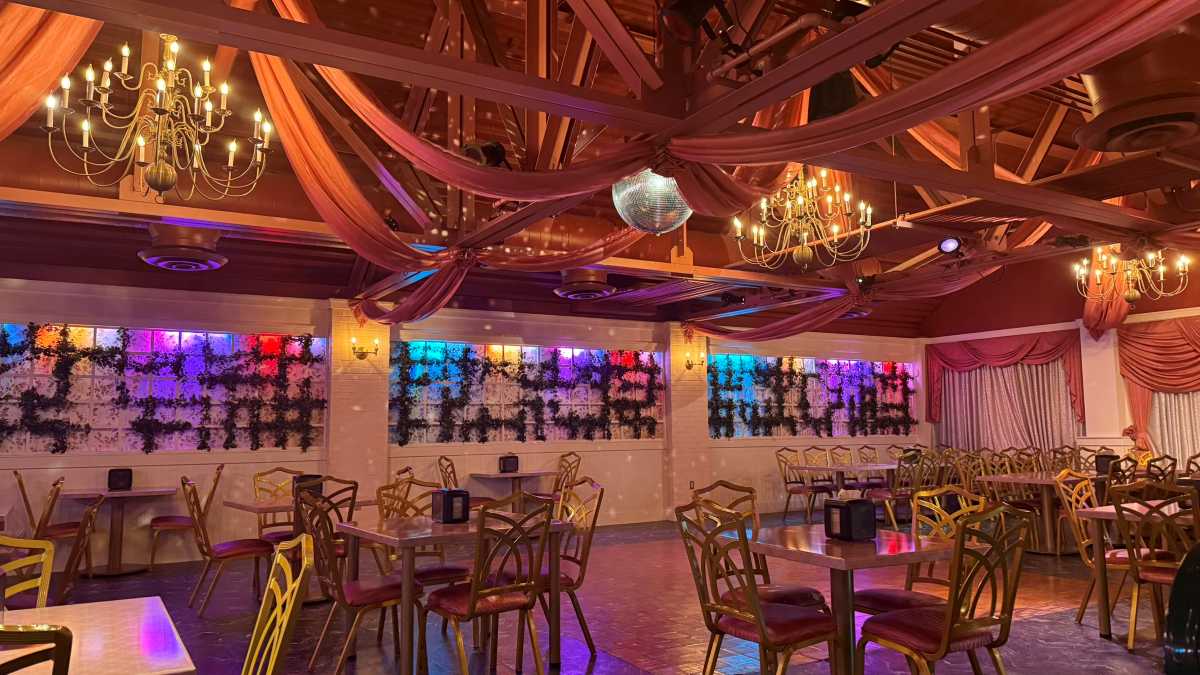 One of the most bizarre and delightful spaces in all of Walt Disney World sits quietly above PizzeRizzo: an ongoing 1980s-style wedding reception. Themed with checkerboard floors, disco lighting, and looping DJ announcements, the room feels frozen in time. Guests can sit among half-finished cakes, mismatched party favors, and a dance floor ready for a celebration that never quite happens.