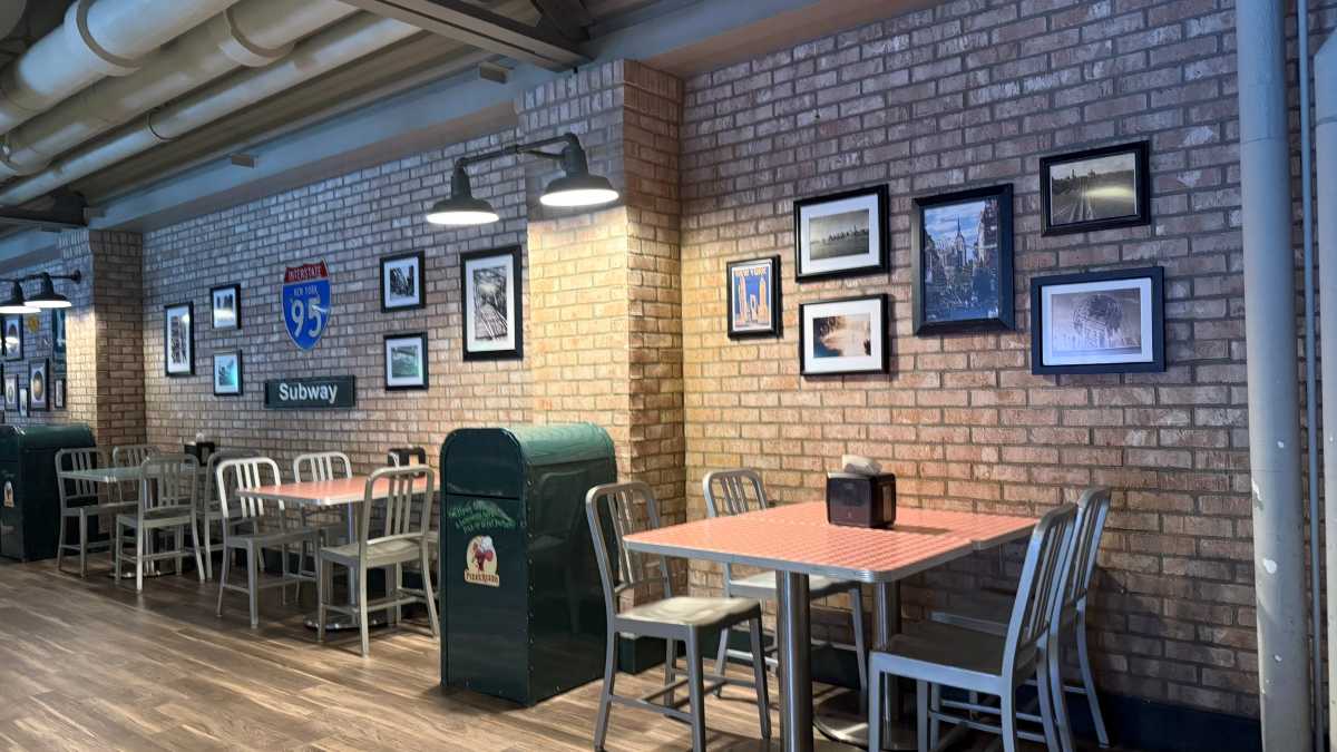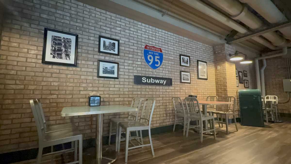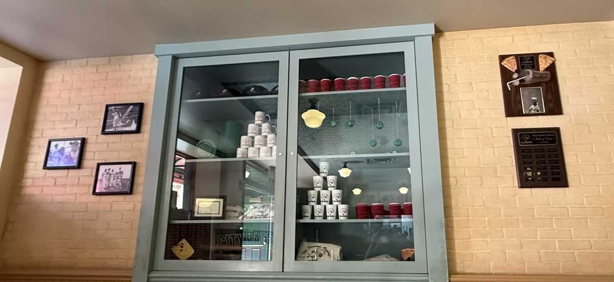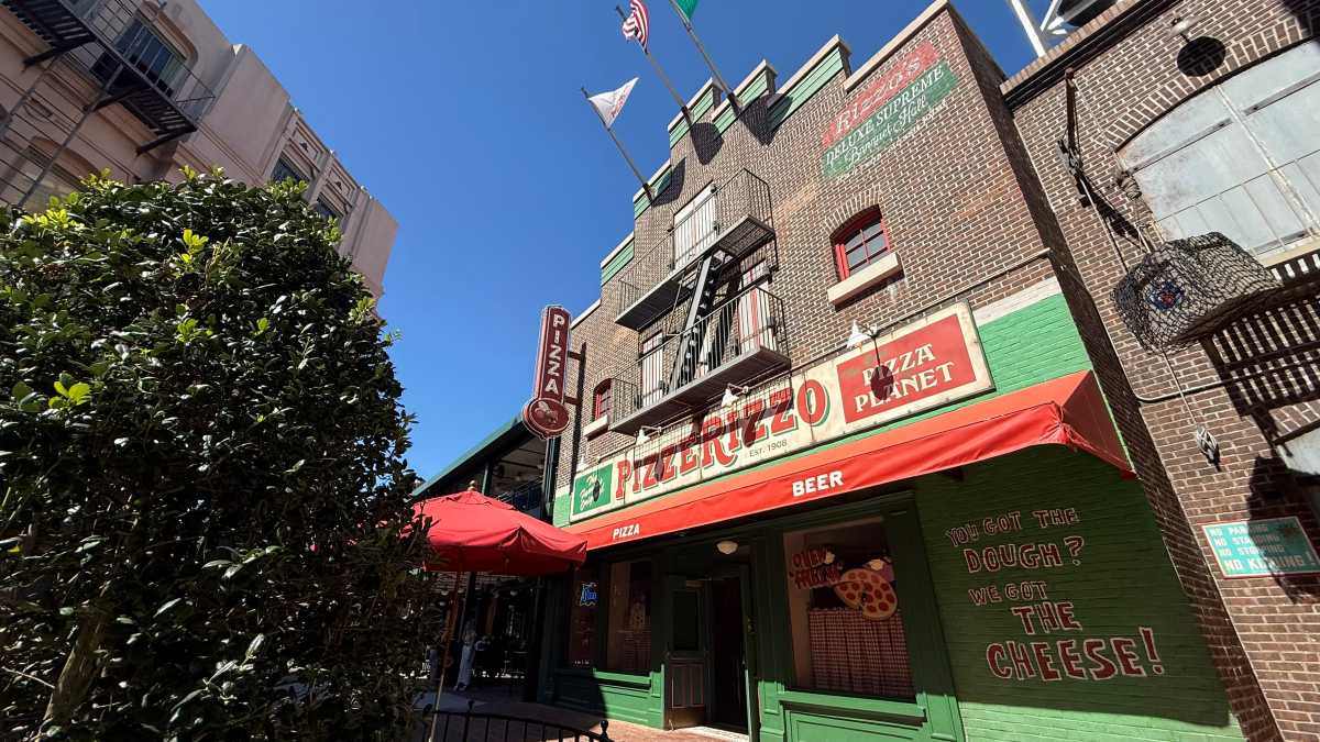 Outside PizzeRizzo: A classic New York-style facade with Muppet flair. Themed signage, brick walls, and quirky details set the stage for what’s inside.