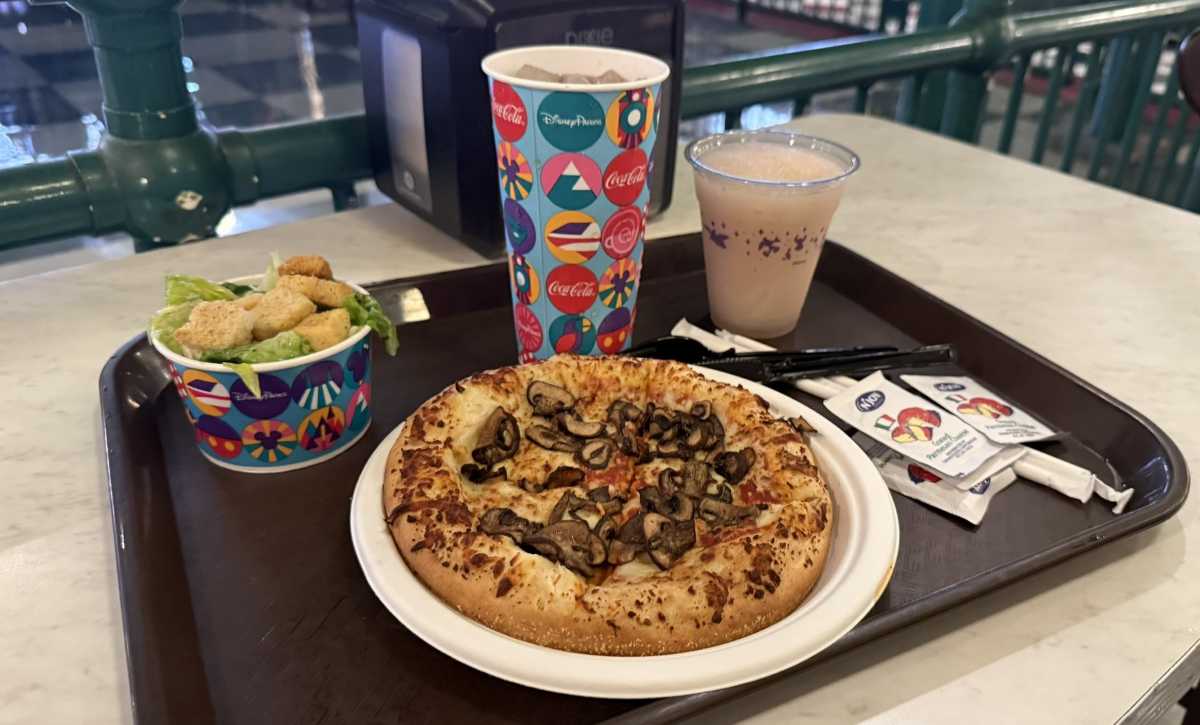 One last meal at PizzeRizzo: mushroom pizza and a side salad enjoyed upstairs in the unforgettable Muppet wedding reception room. A quirky farewell to a Disney hidden gem.