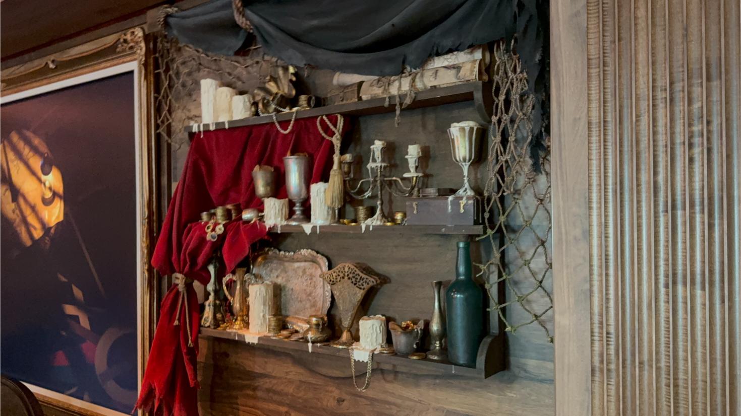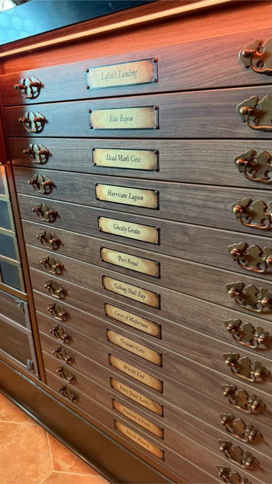 There is even a set of 13 drawers filled with treasure maps. Each is labeled with a different scene representing global parks and attractions, including The Ghostly Grotto, Port Royale, Talking Skull Bay, Blue Bayou, and Treasure Cove. Meanwhile, the stacked treasure chests that make up the bar front nod to the treasure rooms and Captain’s Quarters in the films.