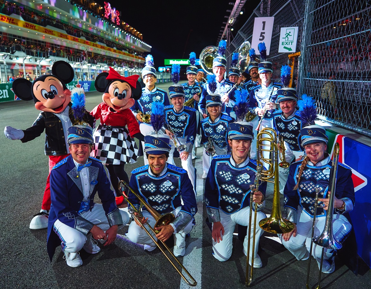 To start race day celebrations, the Disneyland Band performed a special rendition of the national anthem. Musician and actor Adrian Lyle joined the moment, marking a rare crossover between Disney Parks entertainment and Formula 1’s global stage.