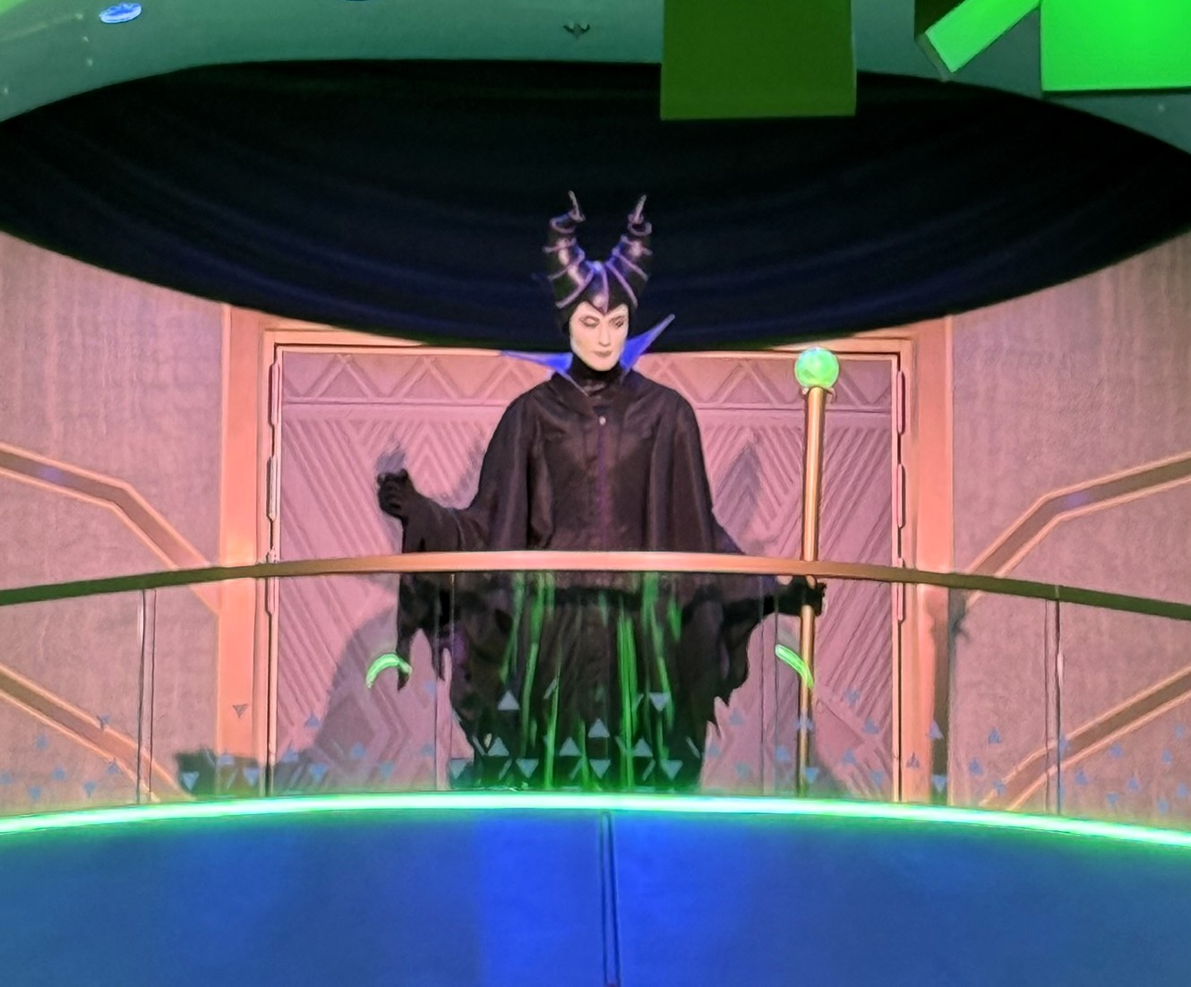 The performance builds to a memorable finale. As the story reaches its climax, the Grand Hall transforms. Lighting changes, music swells, and Maleficent herself appears. The dramatic entrance contrasts sharply with the comedic tone, grounding the show in Destiny’s broader storytelling.